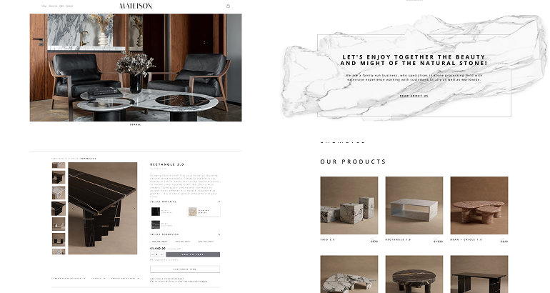 The platform allows customers to explore products in detail, configure materials and dimensions, and place orders directly online. Because every stone slab is unique, the system highlights the individuality of each item while offering a seamless, intuitive shopping experience. The goal of the project was to merge tradition with digital convenience: staying true to Mateison’s hands-on, client-focused approach while introducing a new way for customers to buy ready-made natural stone products.